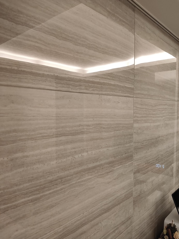 ダイニングの壁面は代理石彫のタイル。ここは前にも書いたけれど