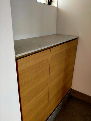 天板にした下駄箱。この石はキッチンや洗面所と合わせました。