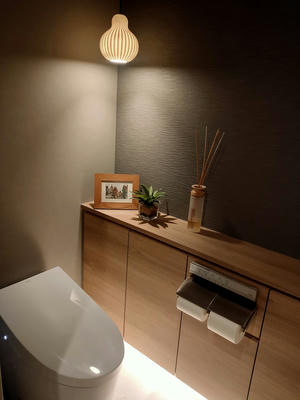洗面所の写真手前にトイレがあり間接照明とペンダントライト。