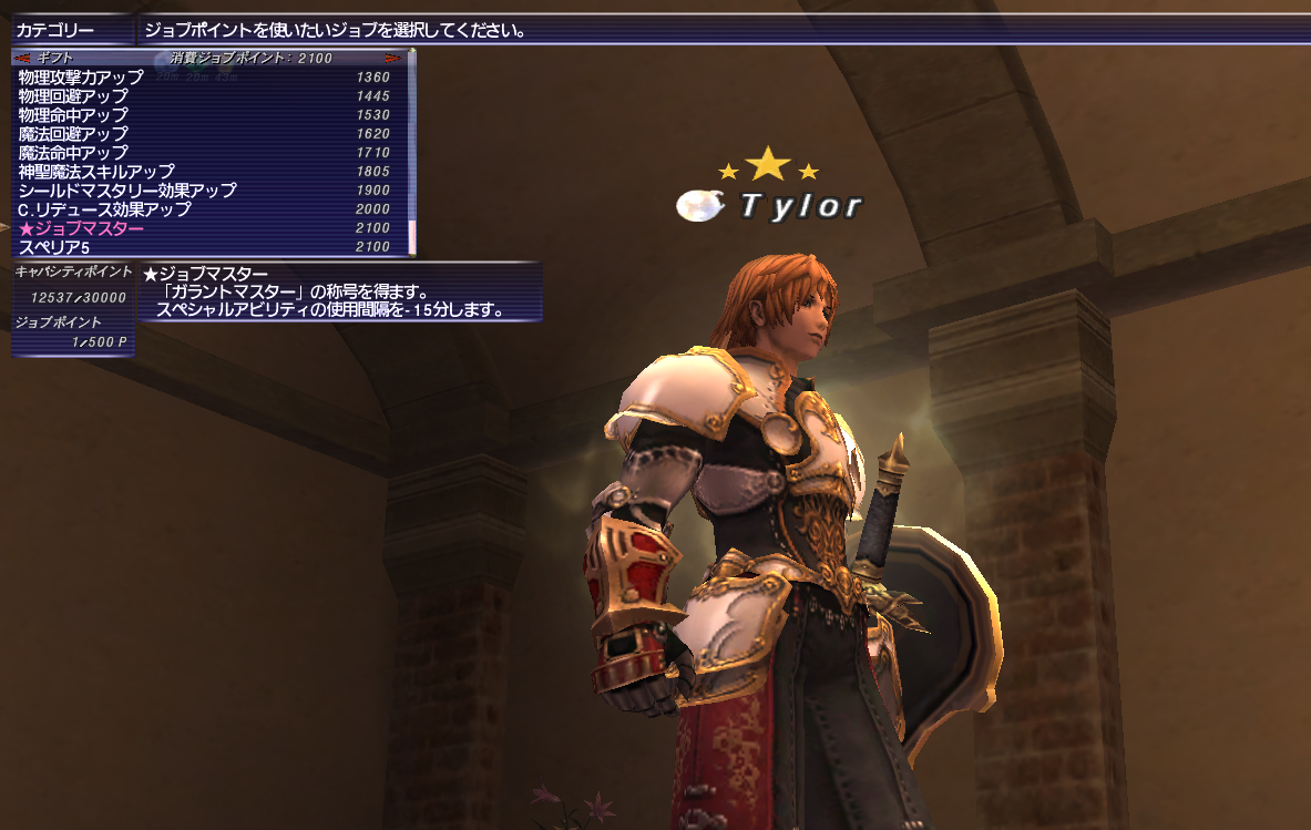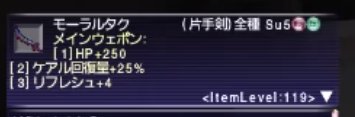 | ナイト | モーラルタク | 片手剣 | D180 隔260 HP+130 MP+70 命中+50 魔命+50 魔法ダメージ+217 片手剣スキル+269 受け流しスキル+269 魔命スキル+255 現在HPの3%を防御力に加算 |
